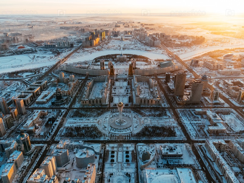 Вид с воздушного дрона Нур-Султан, Казахстан Центр города Казахстана с небоскребами и башней Байтерек