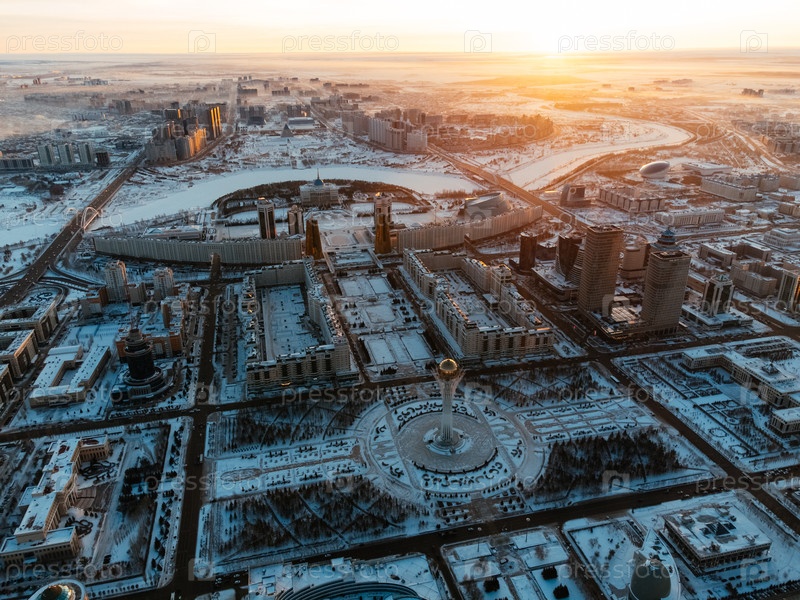 Вид с воздушного дрона Нур-Султан, Казахстан Центр города Казахстана с небоскребами и башней Байтерек