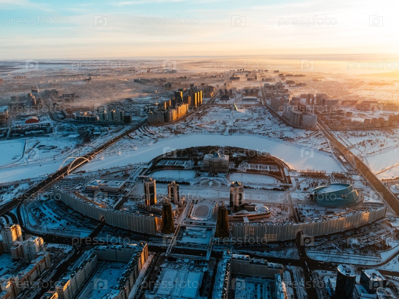 Панорама из воздуха городского горизонта Астаны зимой со снежными дорогами и современной архитектурой