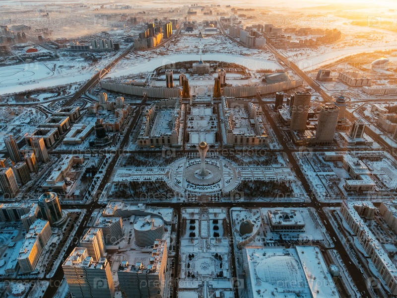 Панорама из воздуха городского горизонта Астаны зимой со снежными дорогами и современной архитектурой