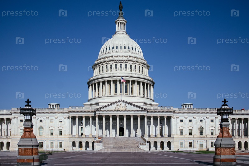 Здание Капитолия Соединенных Штатов с культовым куполом и американским флагом под чистым голубым небом в Вашингтоне, округ Колумбия, США