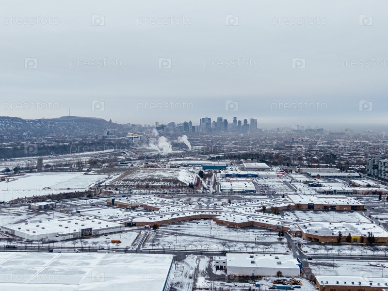 Зимний вид из воздуха пригородов Монреаля, заснеженный парк ангригнон и река возле Лачина и Вердена под облачным небом
