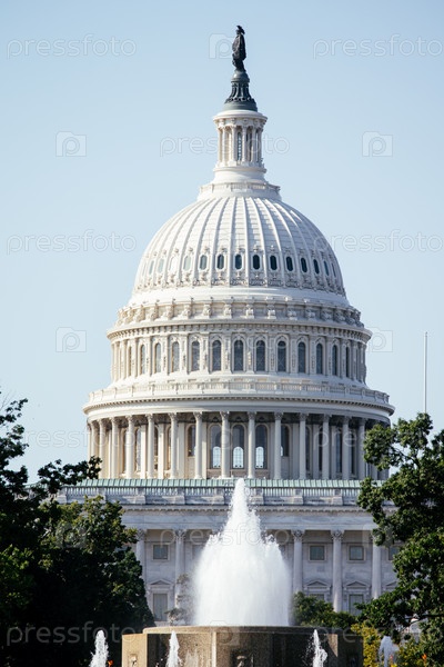 Здание Капитолия Соединенных Штатов с культовым куполом и американским флагом под чистым голубым небом в Вашингтоне, округ Колумбия, США