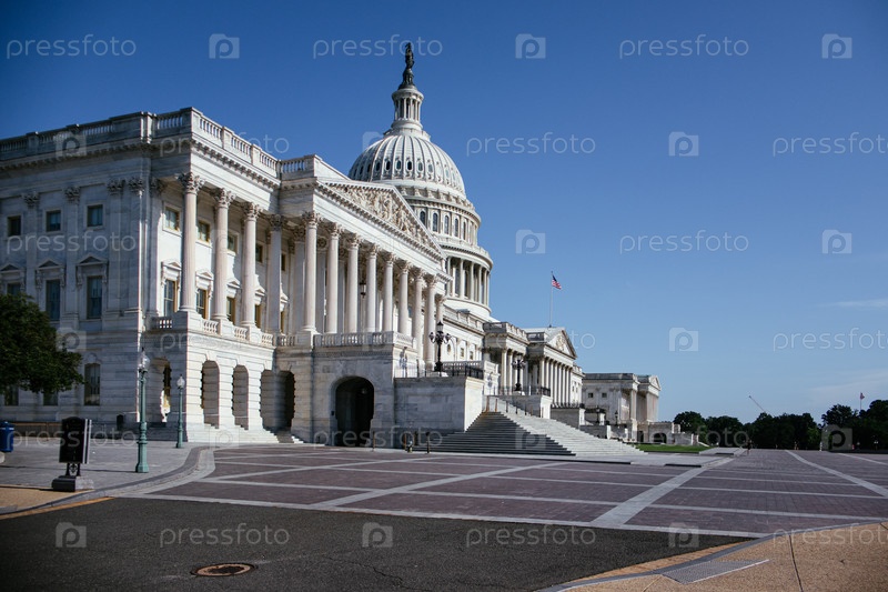 Здание Капитолия Соединенных Штатов с культовым куполом и американским флагом под чистым голубым небом в Вашингтоне, округ Колумбия, США