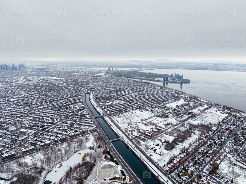 Зимний вид из воздуха пригородов Монреаля, заснеженный парк ангригнон и река возле Лачина и Вердена под облачным небом
