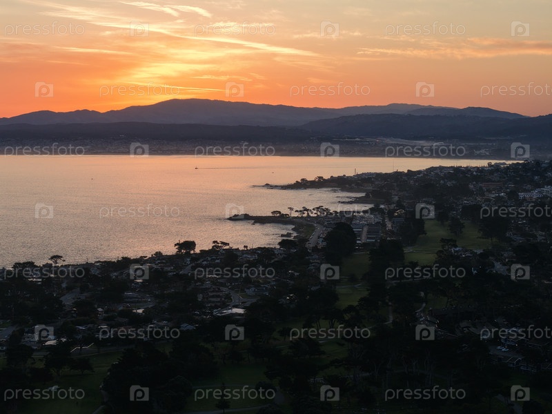 Воздушный закат над береговой линией Монтерейского залива с полем для гольфа, океанскими волнами и живописным ландшафтом Калифорнии