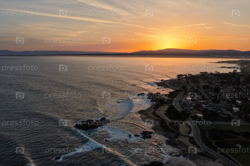Воздушный восход солнца над береговой линией залива Монтереи с полем для гольфа, океанскими волнами и живописным ландшафтом Калифорнии