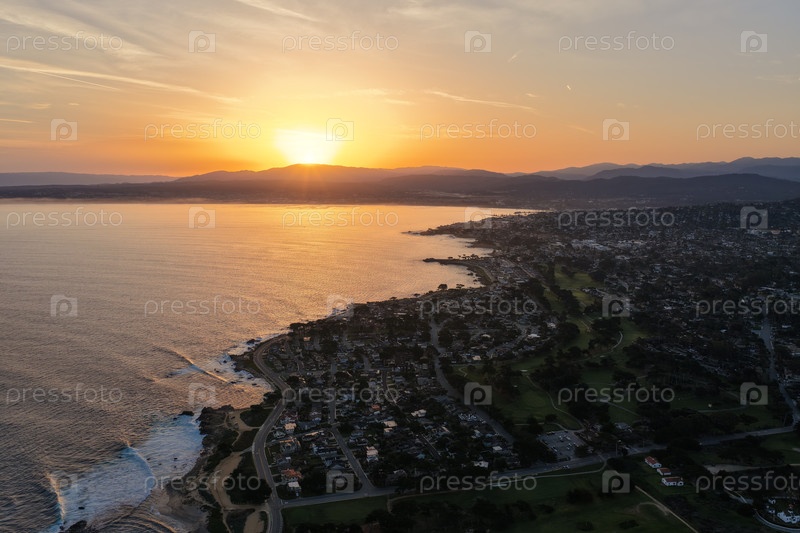 Воздушный восход солнца над береговой линией залива Монтереи с полем для гольфа, океанскими волнами и живописным ландшафтом Калифорнии