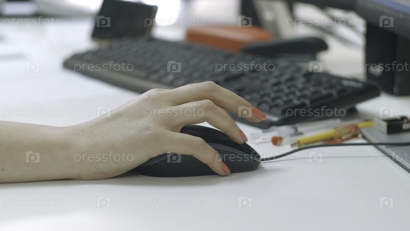 Близкий план женщины, работающей на компьютере в офисе.Креативность.Женщина водит компьютерную мышь за столом.Рука женщины с маникюром выивает с компьютерной мышкой