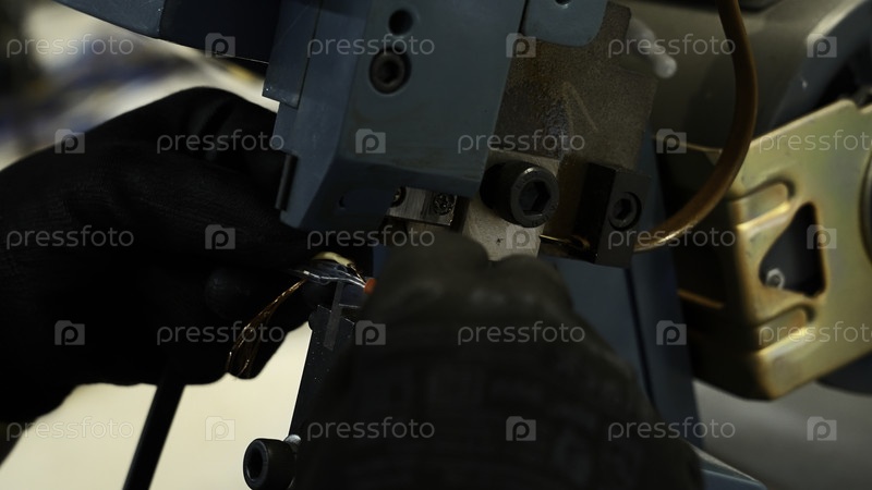 Ближайшее изображение рук рабочего, делающего проволоку с помощью специальной машины.Креативность.Промышленный опыт на фабричной мастерской