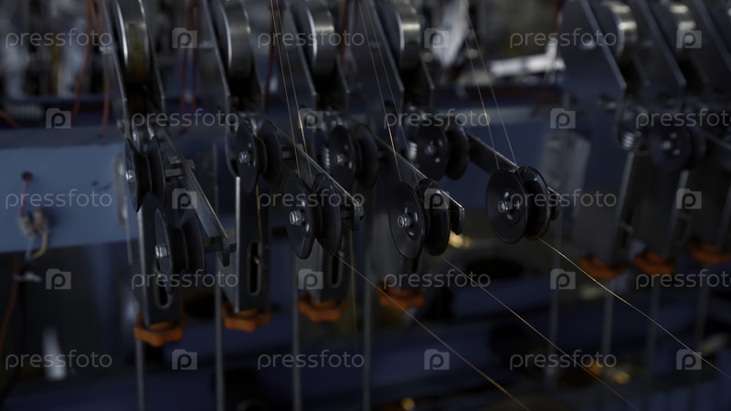 Близкий снимок многих маленьких стальных катушек на фабрике.Креативный.Индустриальный фон с тонкими проводами, простирающимися от спинных катушек
