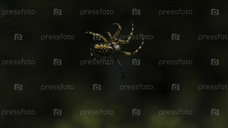 Ближайшее изображение паука, прячущего свою паутину.Креативно.Маленькое насекомое-паук на размытом зеленом фоне