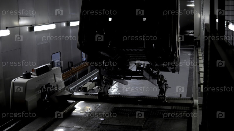 Интерьер большого современного завода по производству грузовых автомобилей. Сцена. Части кузова грузовика внутри мастерской