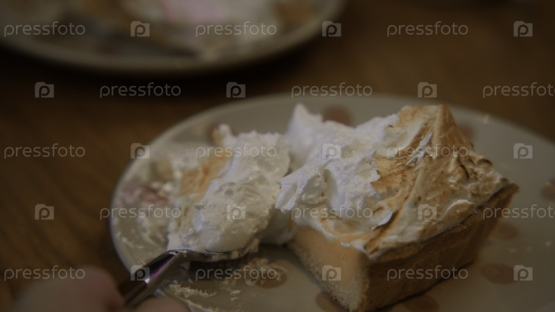 Ближайшее изображение мужчины, медленно поднимающего ложку с вкусным пирогом