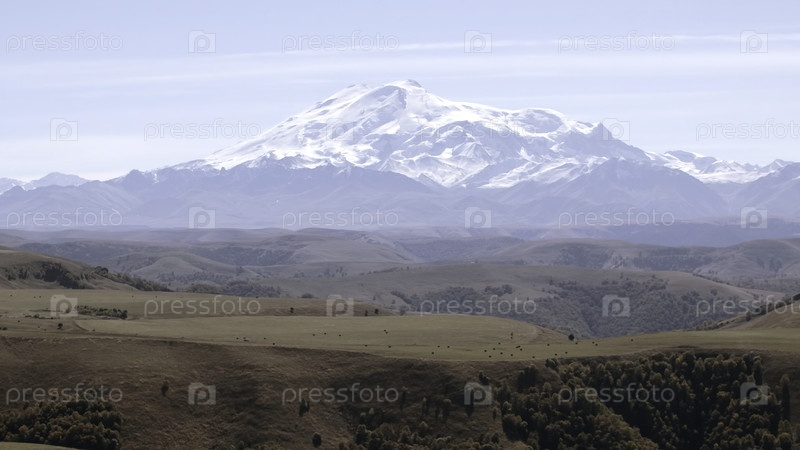 Живописная долина с желтыми лугами и гигантские холодные горы с белыми вершинами
