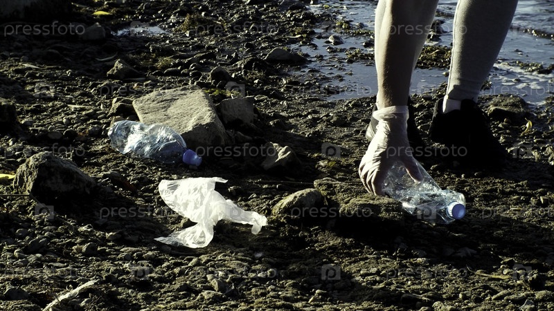 Работа в команде очищает пластик на пляже.Движение.Волонтеры собирают мусор с берега реки, загрязнение пластмассой и концепцию экологической проблемы