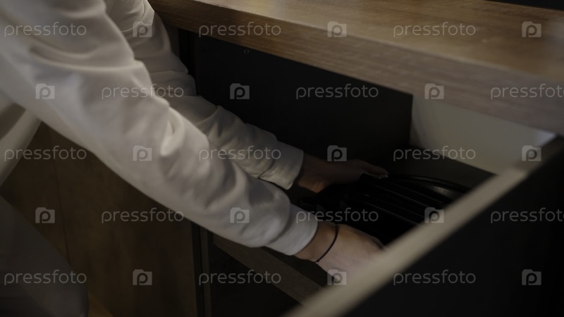 Работа повара. Действие. Работник общественного питания готовит рабочее место, удаляя лишние блюда и готовляет ингредиенты. Запись высокого качества 4k