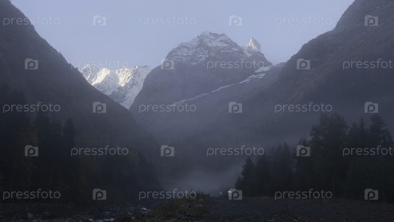 Живописный вид на ущелье между горами. творческий. красота природы и гор с лесом