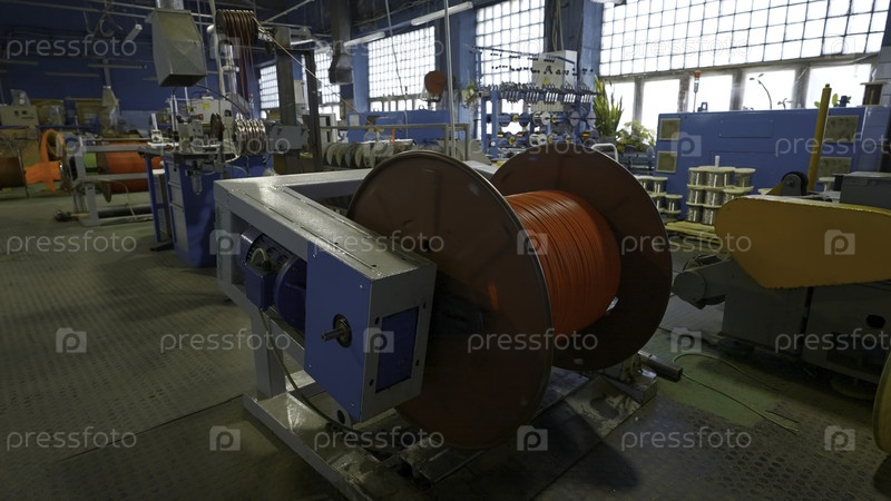 Вращающаяся катушка с проводами на фабрике. творческий. обмотка кабеля в катушку на производственной машине. процесс обмотки кабелей на металлургическом заводе