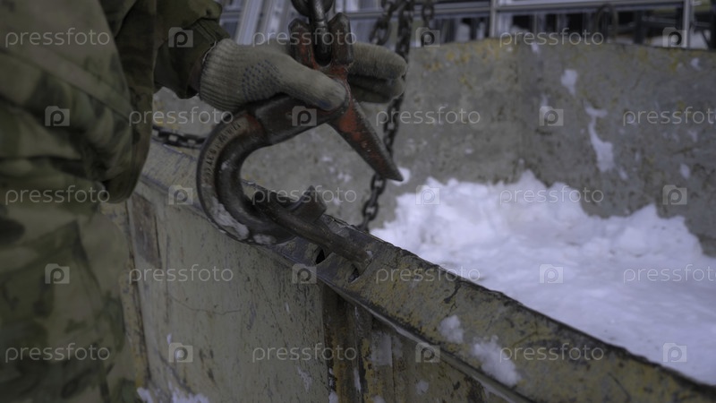 Ближайшее изображение строителя, привязывающего крюк к нагрузке. клип. фиксация крюка для подъема груза. трейлер с крюком для тяжелой нагрузки для поднятия краном