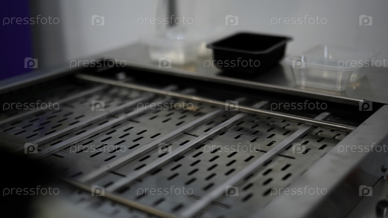 Ближайшее изображение автоматической конвейерной ленты на фабрике СМИ Руки мужчины кладут маленькие пластиковые коробки на пустой конвейер