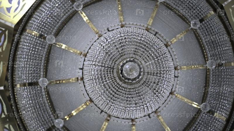 Кристальная люстра в храме. Сцена. Красивый свет кристаллической люстры под куполом храма. Купольный свод с люстру и хрустальными орнаментами в храме