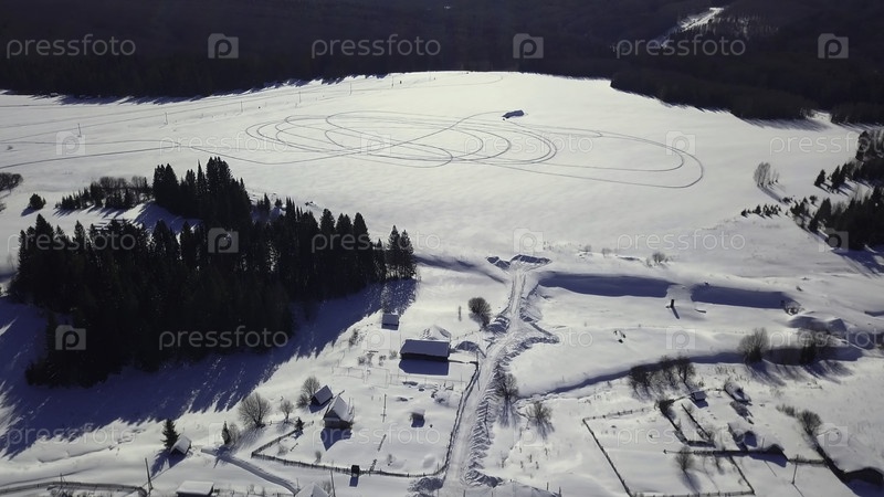 Зимние пейзажи сделаны из вертолета.Клип.Маленькие деревни посреди лесов, на которые падает солнечный свет