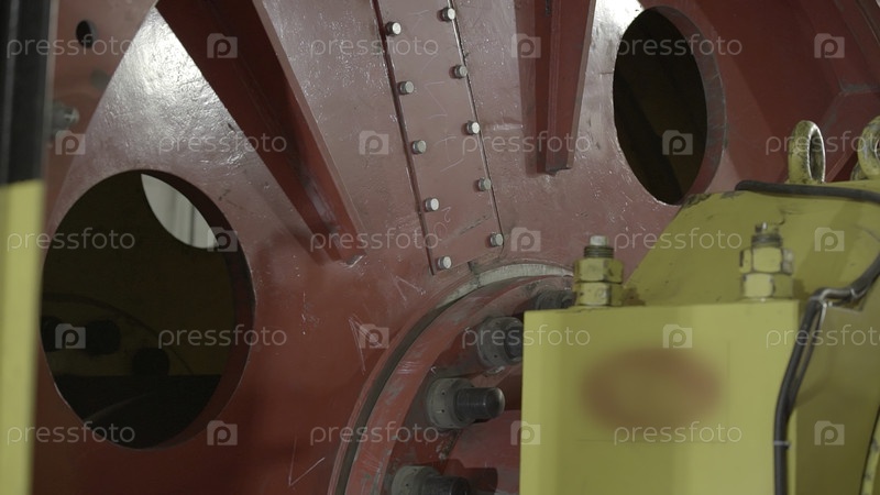 Подробный и всеобъемлющий взгляд на ярко-красную часть промышленной машины, которая демонстрирует различные инженерные элементы