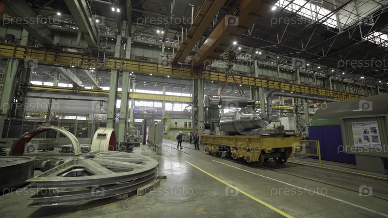 Широкое и просторное пространство промышленной фабрики, выделяющее тяжелую технику наряду с оживленной производственной линией