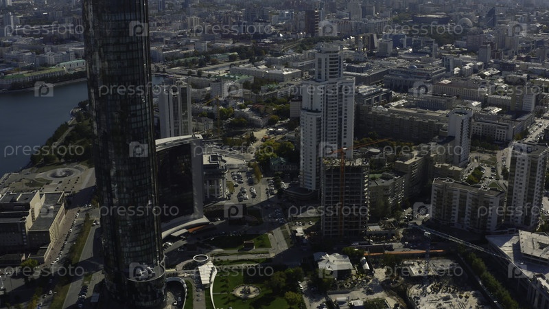 Вид сверху на строительство здания в центре города с многоэтажными домами. Скриншоты. Ландшафт города со многоэтажками и строящимся зданием в центре. Красивый летний пейзаж современного города с небоскребами