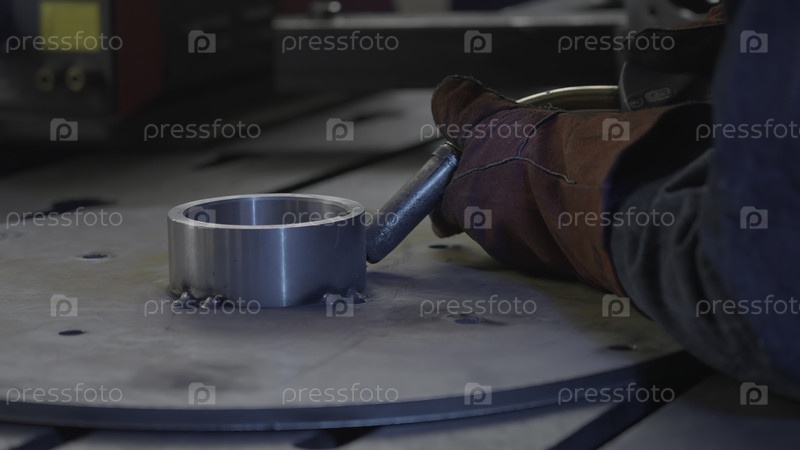 Сварщик в перчатках удерживает сварку летящими искрами.Креативное.Искры во время работы со сварочными и стальными конструкциями.Сваровая труба с искрами из металлической структуры