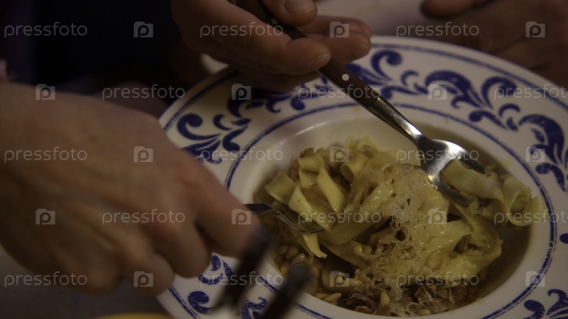 Ресторанные блюда. Стоковые кадры. Красивые блюда салат и макароны на ужин в красивой большой декорированной тарелке. Высокое качество 4k запись