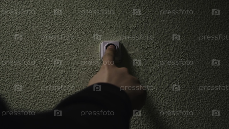 Концепция. Близкий план человека, нажимающего дверной звонок рукой. Звонок любовников на стене по двери. Гость нажимает дверный звонок