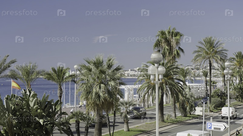 Летний пейзаж с пальмами. Действие. Вид на океан, автомобили и растущие тропические деревья