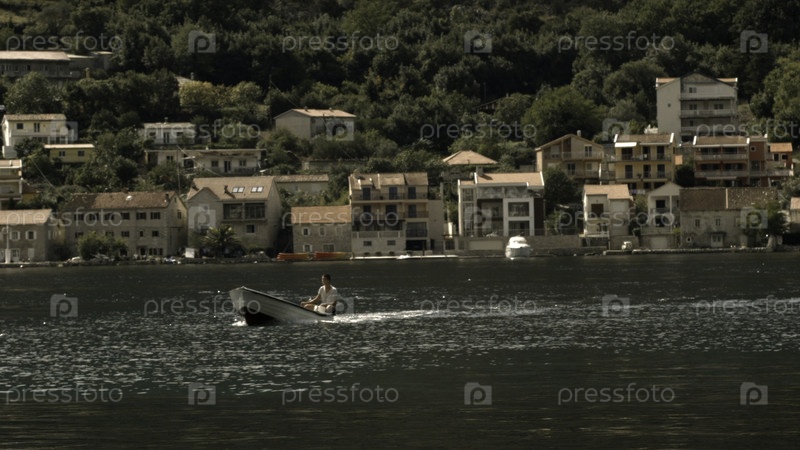 Вид с моря на красивое побережье с плавающей небольшой моторной лодкой.Креативный.Летний туристический регион