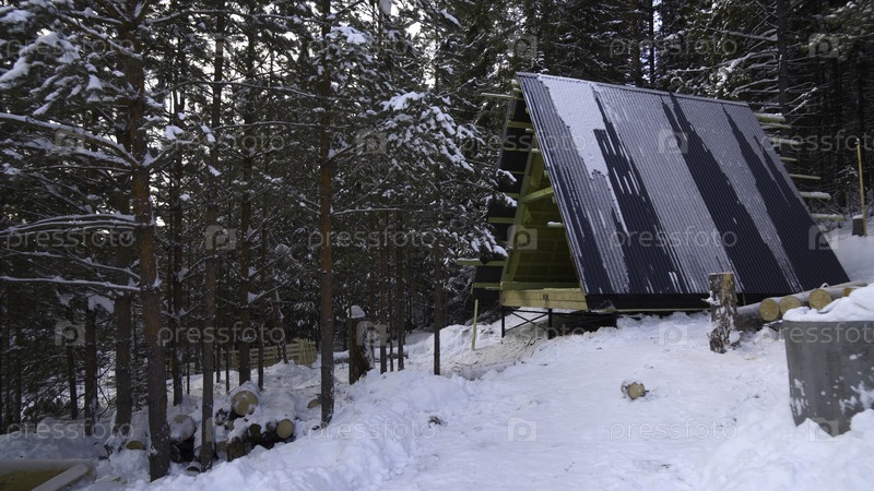 Строительство дома в лесу. клип. треугольный загородный дом в лесу зимой. строительство современного коттеджа в лесу зимой