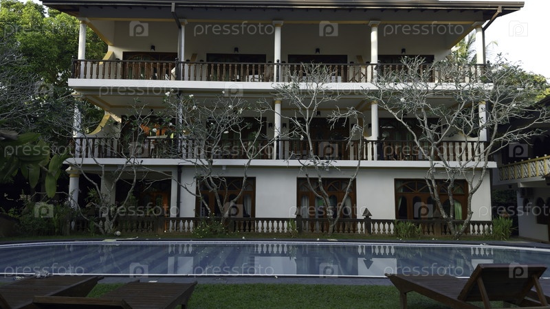 Роскошный коттедж с пышно-зелеными кустами и бассейном.Действие.Концепция летних каникул