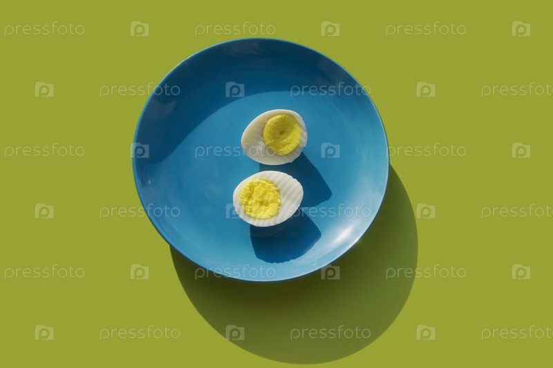 Две половинки яиц без скорлупы на синей тарелке и светло-зеленом фоне.Солнечный свет с острыми тенями.Копировальное пространство.Плоская кладка