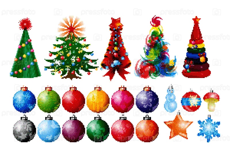 Пиксельный набор рождественских елок и игрушек