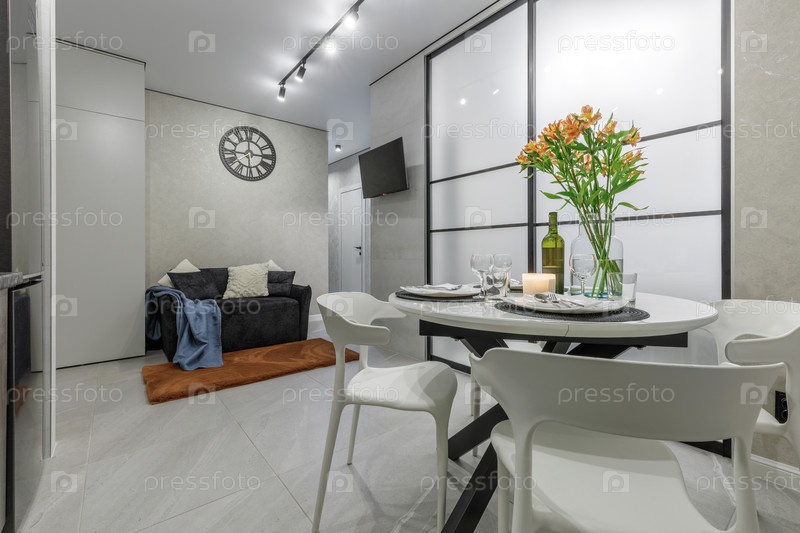 Современный интерьер студии с открытым планом, в котором установлен обеденный стол с белыми стульями, яркими оранжевыми цветами и уютной гостиной с темным диваном и большими настенными часами на заднем плане
