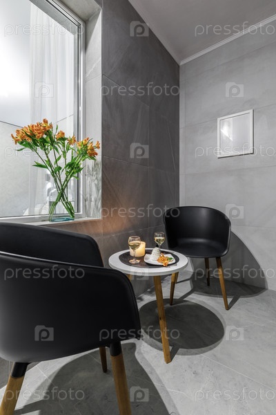 Близкий вечерний снимок стильной замкнутой лоджии с двумя черными минималистическими стульями и небольшим круглым столом, на котором изящно установлены два бокала белого вина, зажженная свеча и десерт, создавая романтичную и уютную атмосферу