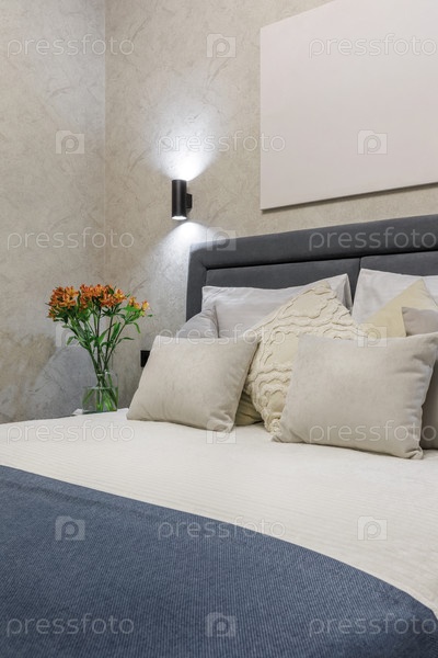 Современный интерьер спальни с серой головкой, белой текстурированной постельной тканью и различными бежевыми декоративными подушками. гладкая настенная лампа обеспечивает мягкое свечение против текстурированных обоев с оранжевыми цветами в фоне