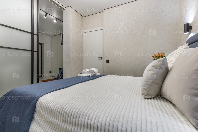Перспективный снимок из кровати с белым текстурированным постельным бельем и голубым одеялом.Вид простирается мимо серой головки и белой двери к стеклянной раздвижной перегородке и яркому коридору со световым освещением