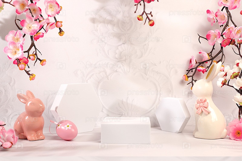 Абстрактная пасхальная композиция праздничных кроликов, украшенных яиц и пустых стендов на элегантном кухонном столе на фоне весенних вишневых цветов