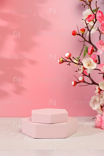 Элегантный солнечный красочный баннер, фон с розовыми цветами сакуры для дизайна. Пустой красивый весенний подиум и шаблон для вашего творчества, стенд продуктовой выставки и концепция летней вечеринки