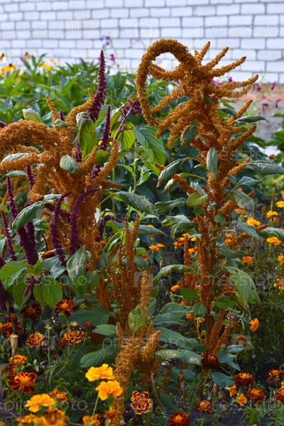 Цветки желтого амаранта в летнем саду.Амарант под солнечными лучами