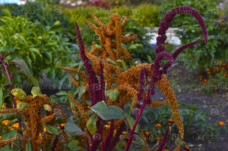 Цветки желтого амаранта в летнем саду.Амарант под солнечными лучами