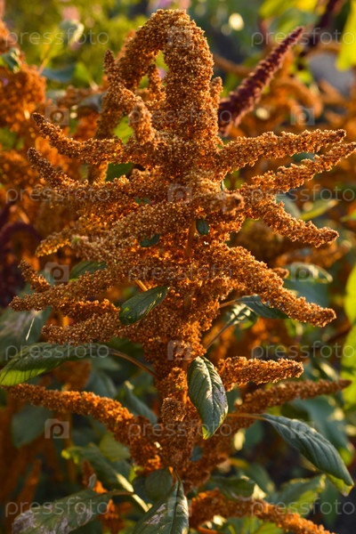 Цветки желтого амаранта в летнем саду.Амарант под солнечными лучами