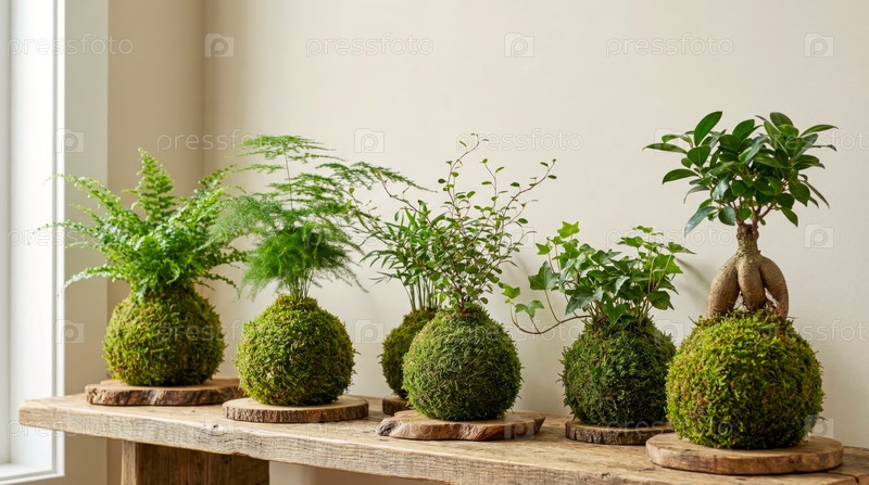 Kokedama Plants Displayed on Wooden Table. созданный искусственным интеллектом