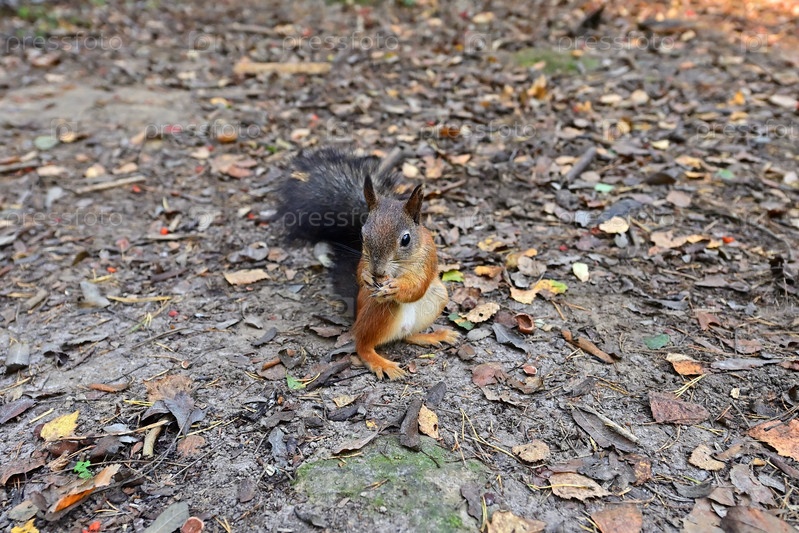 Милая белка в лесу на земле грызет орех